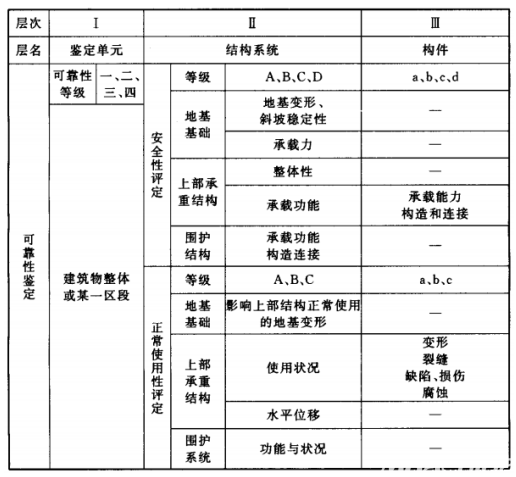 工業(yè)建筑物的可靠性鑒定評(píng)級(jí),應(yīng)劃分為構(gòu)件、結(jié)構(gòu)系統(tǒng)、鑒定單元三個(gè)層次;其中結(jié)構(gòu)系統(tǒng)和構(gòu)件兩個(gè)層次的鑒定評(píng)級(jí),包括安全性等級(jí)和使用性等級(jí)評(píng)定,需要時(shí)可由此綜合評(píng)定其可靠性等級(jí);安全性分四個(gè)等級(jí),使用性分三個(gè)等級(jí),各層次的可靠性分四個(gè)等級(jí),并應(yīng)按下表規(guī)定的評(píng)定項(xiàng)目分層次進(jìn)行評(píng)定。